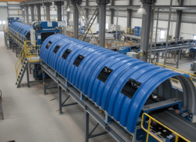 - Простота и скорость монтажа: Панели формуются по заданному радиусу и соединяются между собой и с торцевыми конструкциями с помощью болтовых соединений, что позволяет значительно сократить время монтажа и снизить трудозатраты.